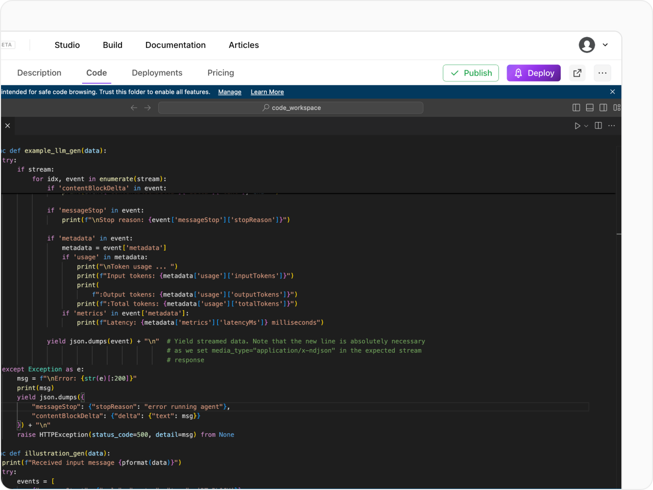 Develop and test your agent directly on our inbuild development environment, ensuring it performs flawlessly and refine its capabilities before deployment.