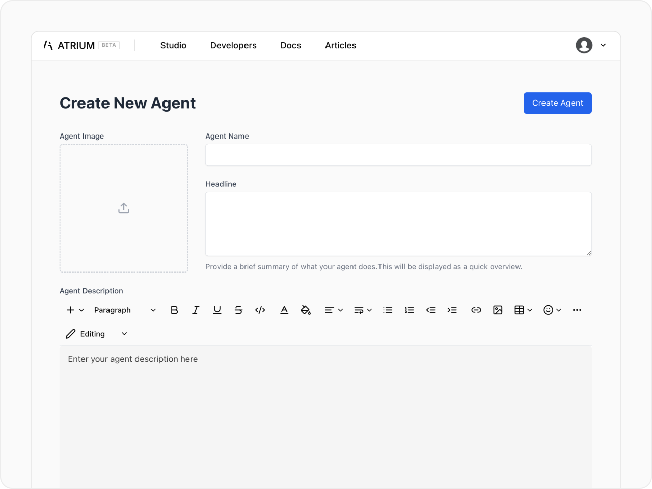 After signing up, set up your developer account. Build an agent by customizing key details like name, image, and description to fit your vision.